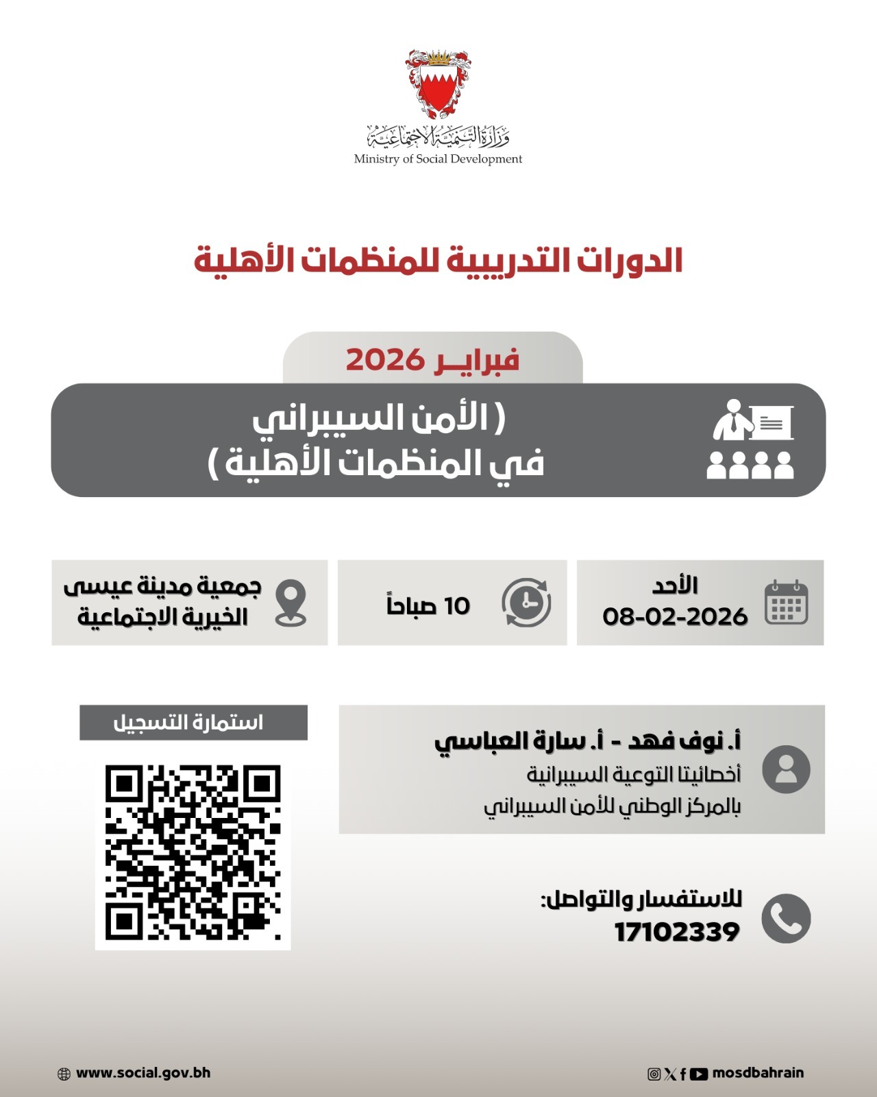 مشاركة جمعية الأل والأصحاب الخيرية في الدورات التدريبية للمنظمات الأهلية بعنوان « الأمن السيبراني في المنظمات الأهلية »والتي نظّمتها وزارة التنمية الإجتماعية بتاريخ فبراير 2026م حيث حضر عن الجمعية كل من السادة ابراهيم الهاشمي الامين المالي و طارق المران عضو الجمعية